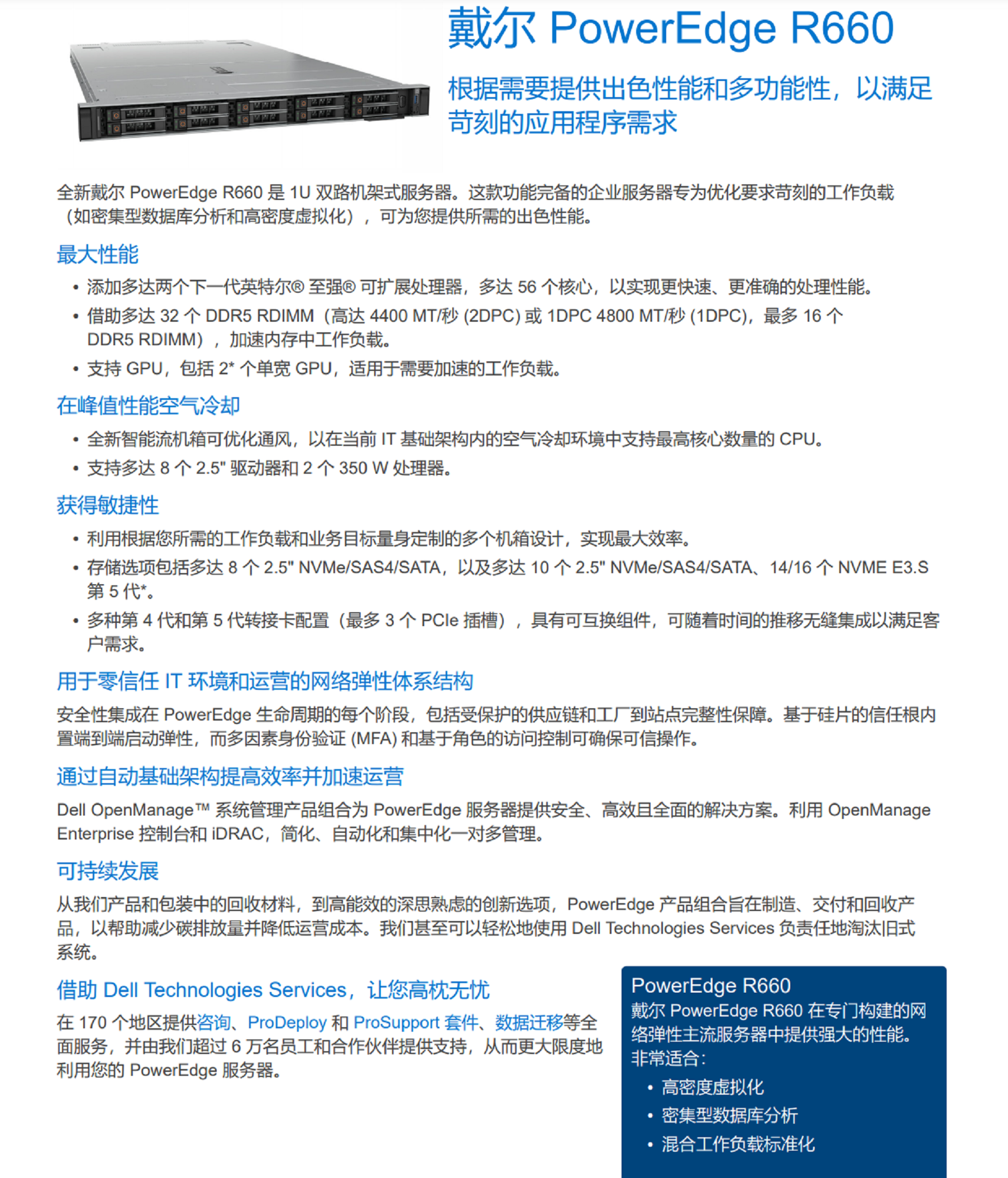 全新戴爾 PowerEdge R660 是 1U 雙路機架式服務器。這款功能完備的企業(yè)服務器專為優(yōu)化要求苛刻的工作負載(如密集型數(shù)據(jù)庫分析和高密度虛擬化),可為您提供所需的出色性能。