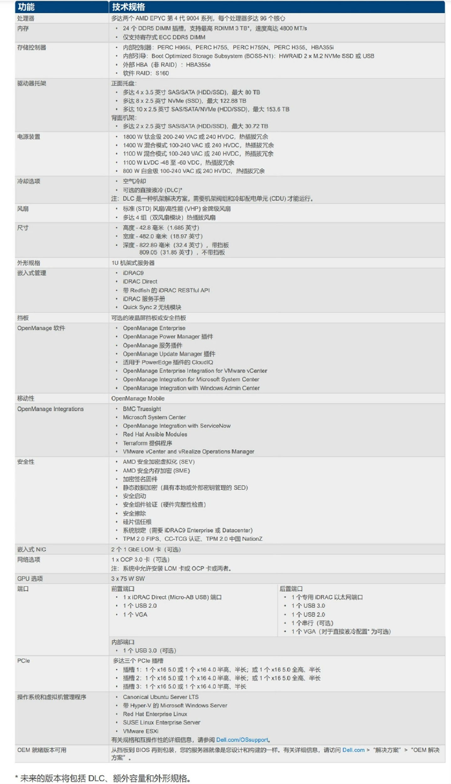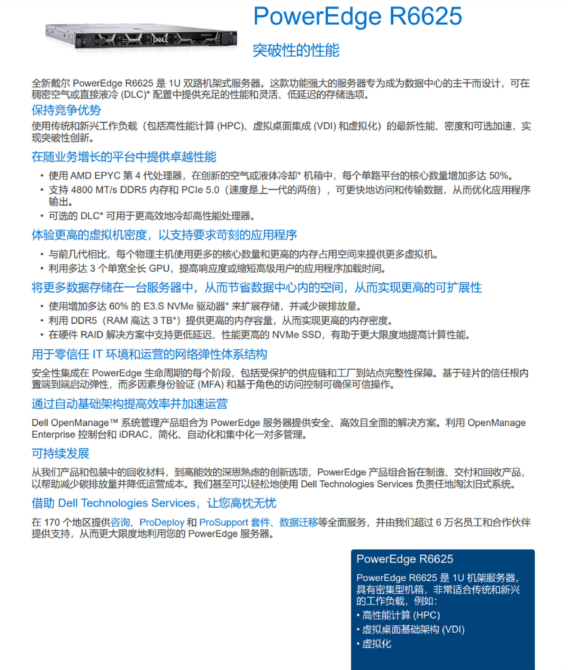 全新戴爾 PowerEdge R6625 是 1U 雙路機(jī)架式服務(wù)器。這款功能強(qiáng)大的服務(wù)器專(zhuān)為成為數(shù)據(jù)中心的主干而設(shè)計(jì),可在稠密空氣或直接液冷 (DLC)* 配置中提供充足的性能和靈活、低延遲的存儲(chǔ)選項(xiàng)。