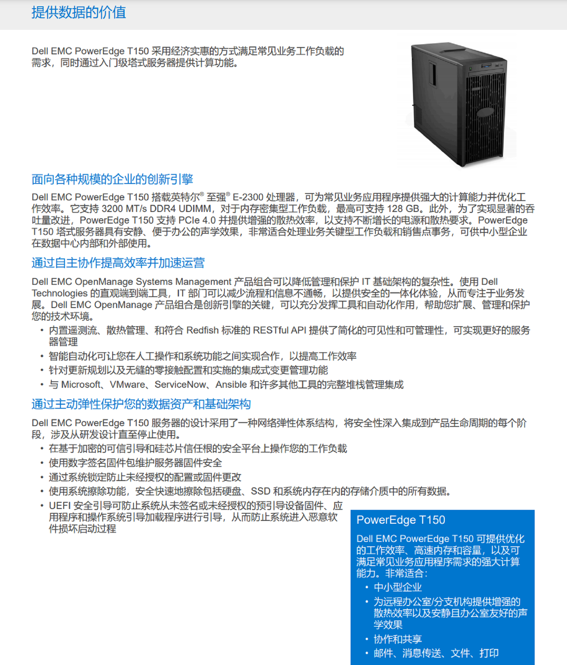 PowerEdge T150 采用英特爾? 至強? E-2300 處理器,是一款入門級塔式服務器,在適應性與經(jīng)濟實惠性之間實現(xiàn)了出色平衡,可滿足不斷變化的計算需求。1.支持 3200 MT/s DDR4 UDIMM,高達 128 GB2.支持 PCIe 4.0,實現(xiàn)了顯著的吞吐量提升3.非常適合文件/打印、郵件/消息傳送、銷售點、Web 托管和協(xié)作4.提高了散熱效率5.借助 UEFI 安全啟動提高了安全性,縮短了啟動時間