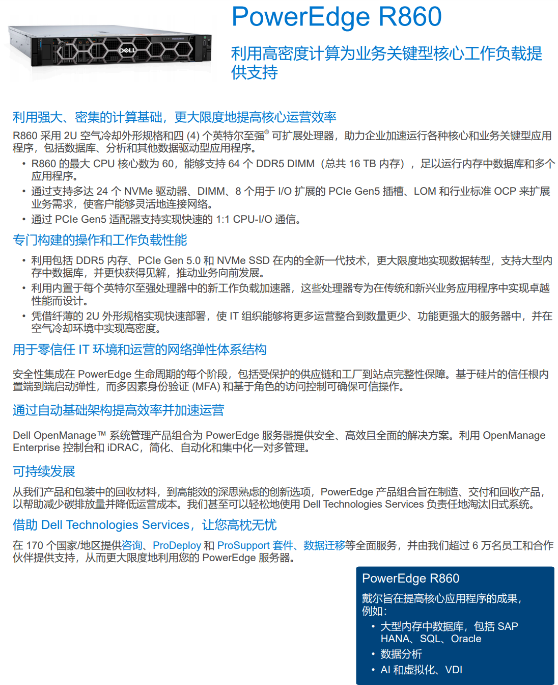 R860 采用 2U 空氣冷卻外形規(guī)格和四 (4) 個英特爾至強? 可擴展處理器,助力企業(yè)加速運行各種核心和業(yè)務(wù)關(guān)鍵型應(yīng)用程序,包括數(shù)據(jù)庫、分析和其他數(shù)據(jù)驅(qū)動型應(yīng)用程序。